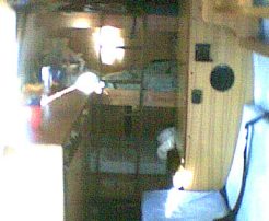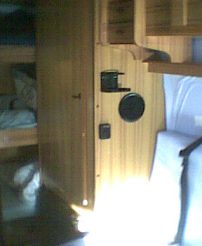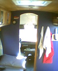 Blick ins Heck. Die Elektrik(Spannungswandler,etc.) sind im Kleiderschrank untergebracht. | Blick nach vorne auf die Trennwand zwischen Fahrerkabine und Wohnraum, mit Schiebetür. |