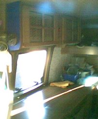 Abdeckbare Küchenzeile mit Oberschränkchen und Lüftungsfenster für Kochdämpfe. | Links sieht man alle 3 Heckbetten, davor ist der Kleiderschrank mit der Truma untendrin. |