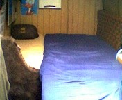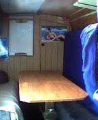So sieht es hinten aus. Links oben ein Krempelschränkchen. Das Weiße hinten an der Wand ist ein Klapptablett (Kunststoff 20 DM) zum Essen im Bett! Das Kissen ist ein Schlafsack für wirklich kalte Tage in der Arktis. ;-) Oder falls das Heizungsgas mal alle sein sollte. Ganz vorne das Moskitonetz für die Tür (5-25 DM). | Die Matratze ist tagsüber hochkant und wird zum fahren mit einem Spanngurt (5 DM) festgezurrt.Hinter dem Poster (Geschenk von Ex-Freundin) befindet sich der Kleiderschrank, darunter die Gasflaschen. Der restliche Raum ist ein von hinten zugänglicher Schrank, für Klo, Waschmaschine(Wonder-Wash 50-90 DM) und sonstiges Gerümpel wie Federball- und Golfschläger(Hüstel) . | So ist das Bett unten und man hat wirklich für 2 Leute Platz. Das Bettzeug kommt in die Ablage über der Fahrerkabine. Die Sitzkonsole (Hufeisenform)ist natürlich Stauraum. Bei dieser Konstruktion ist richtige Lüftung das A und O sonst verschimmelt das Bett innerhalb einer Woche. |