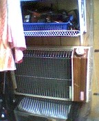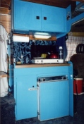 Hier der Küchenblock mit Kühlschrank (rechts), Staufach für Wassertank (links), darüber Spüle, daneben Gaskocher (abnehmbar), darunter ein weiteres Staufach (direkt über Kühlschrank, von oben zugänglich) für Sachen, die keine Feuchtigkeit ziehen sollen, da das Fach immer durch den Kühlschrank mitgeheizt wird.Ganz oben sieht man den Geschirrschrank | Die Heizung (Katalyt) ist zwar in Deutschland nicht zugelassen, stört aber im Rest der Welt niemanden.Darüber eine Ablage, darunter ein 12 Volt - Ofen (unter 100 DM) zum Auf- und Überbacken von z.B. Brötchen oder Toasts. |