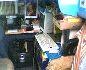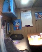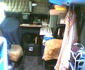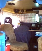 Vorne links, statt drehbarem Sitz einfach aus der Schiene ziehen und mit 2 Spannbändern (Kosten=10 DM) verdreht wieder festzurren. Nein, der Klinometer (wer ihn sieht) ist unverkäuflich! | Die Lenkradabdeckung ist eine Jeansjacke, die Batterien befinden sich abgedeckt (evtl.Gase) unter und hinter dem Fahrersitz.Darüber sitzt der Solarregler und die Spannungswandler (kurze Wege!). | Das "Büro" ist eine Konstruktion aus Sperrholzbrettchen (ca. 20 -30 DM) die gesteckt wird und innerhalb von 5 Minuten auf oder abgebaut werden kann. Das spart ne Menge Zeit beim Kramen in den Schränken oder Kisten und lohnt sich schon ab 2 Tagen Standzeit. |
