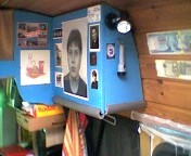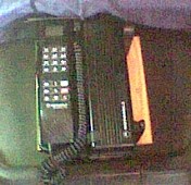 Krempelschränkchen für Hygieneartikel, über dem kleinen Fenster neben der Tür, links daneben (über Fahrerkabine) Ablage für Bettwäsche. Am Schränkchen befindet sich ein drehbarer 12 Volt Spot. | Ein Autotelefon der ersten Generation, mit 8 Watt Leistung (50-100 DM auf Flohmärkten), reicht auch in den entferntesten Regionen noch für eine vernünftige Verbindung und verursacht keinen Krebs wie die Handys, da die Außenantenne auf dem Dach montiert ist. Übrigens ist die Freisprechanlage schon mit eingebaut. |